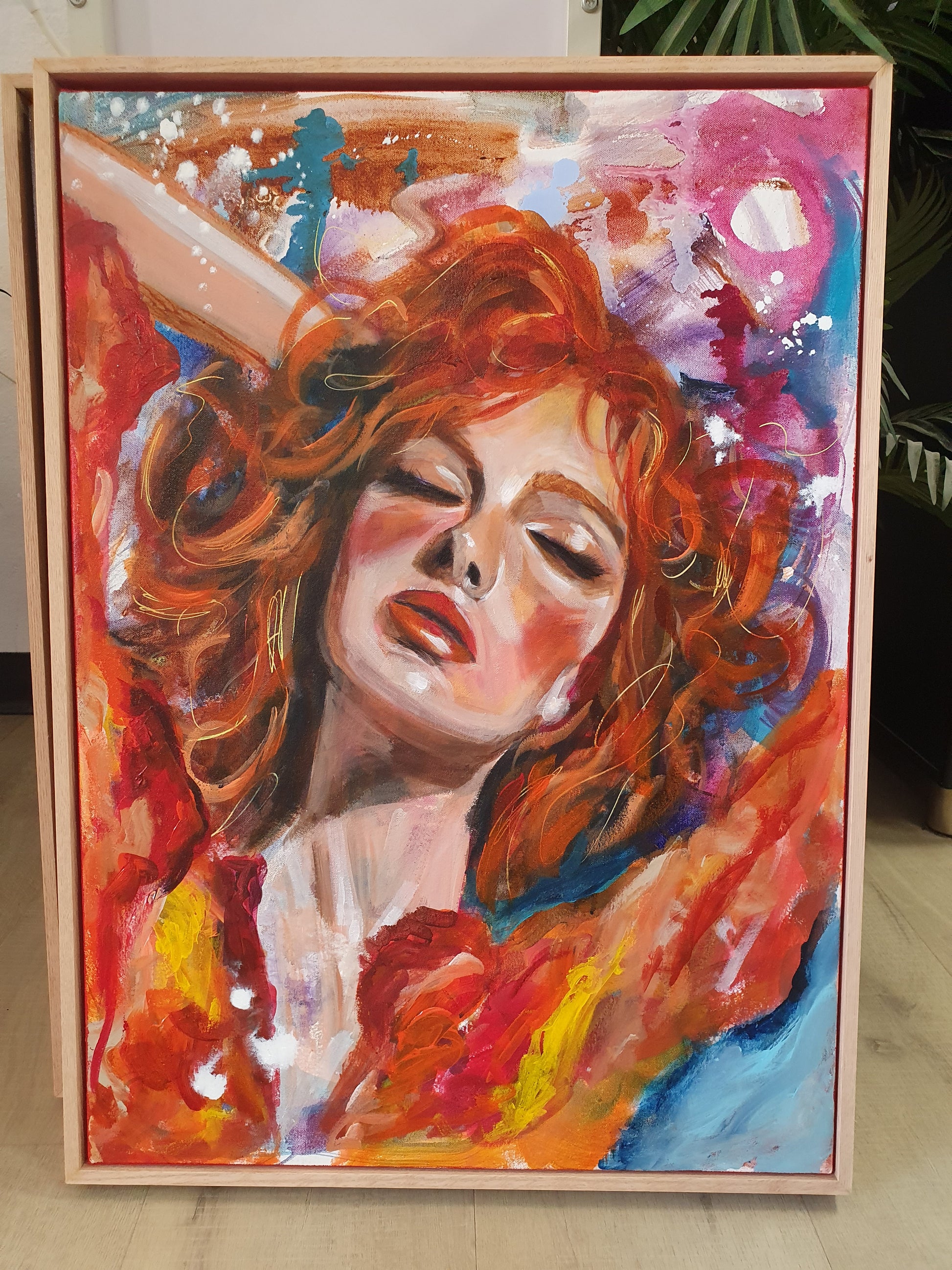 captures a moment of deep emotional surrender — a celebration of freedom, femininity, and vibrant self-expression. With her eyes gently closed and lips softly parted, the figure radiates serenity amidst a storm of color and energy. Her fiery red hair flows like living flame, entangled with swirls of golden light and bold strokes of red, yellow, and blue.